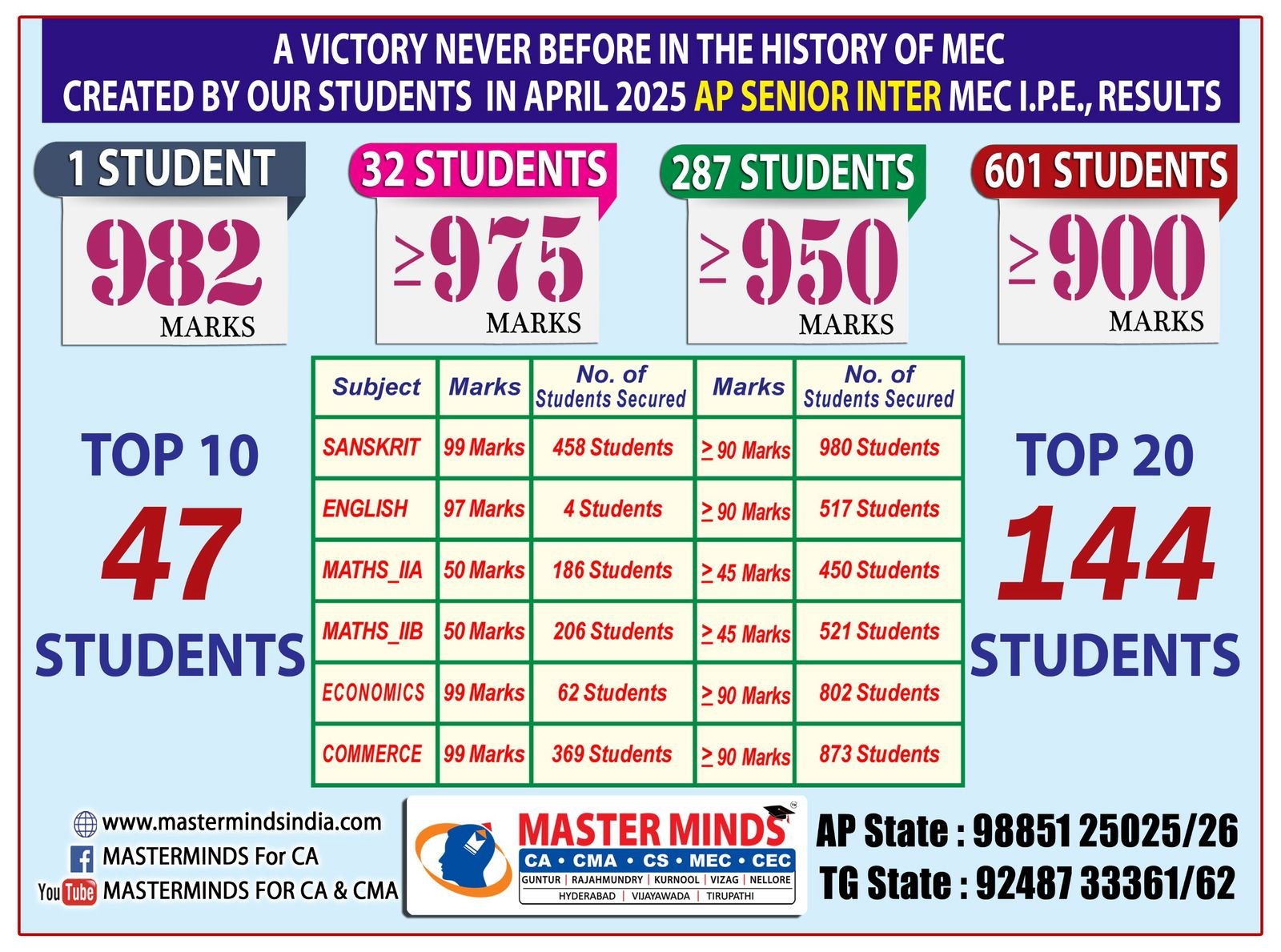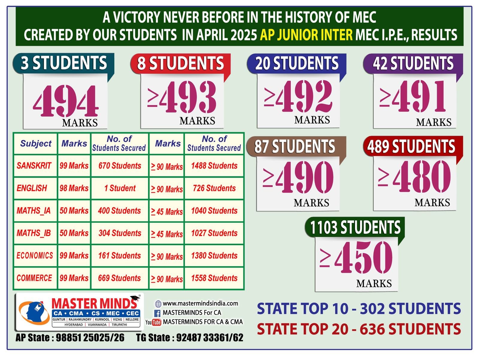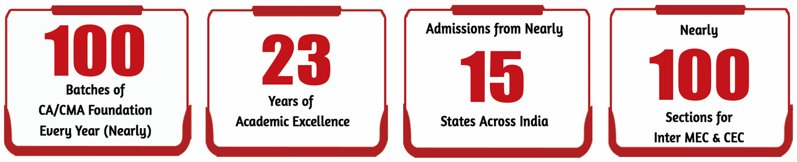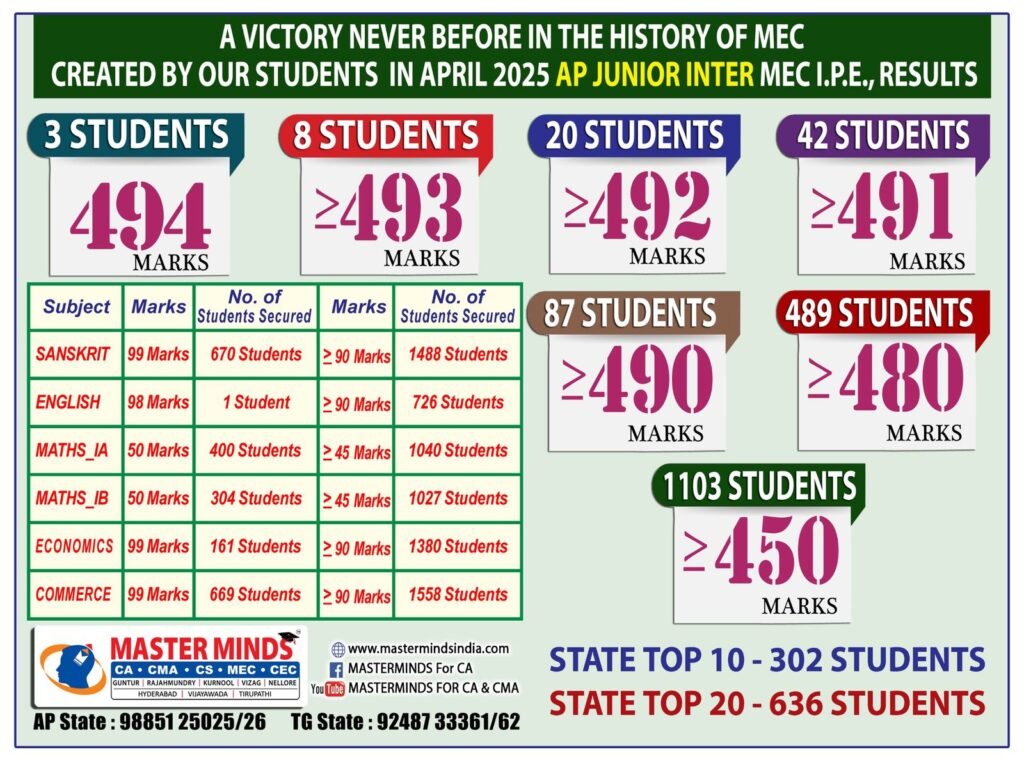 | State First Rank/ 8 consecutive State First Ranks in Intermediate MEC and 20 times State First Rank. Approximately 1,400 All India Ranks in CA/CMA courses till date. |